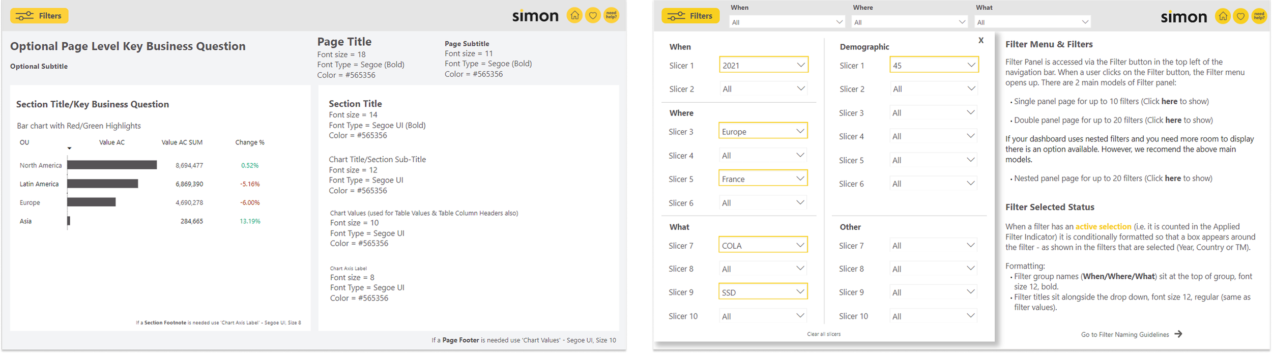 Developer Documentation: Example of 2 sections of the Power BI template, with components built in for immediate use and instructions on design standards, including font sizing, page layout/structure and button states.